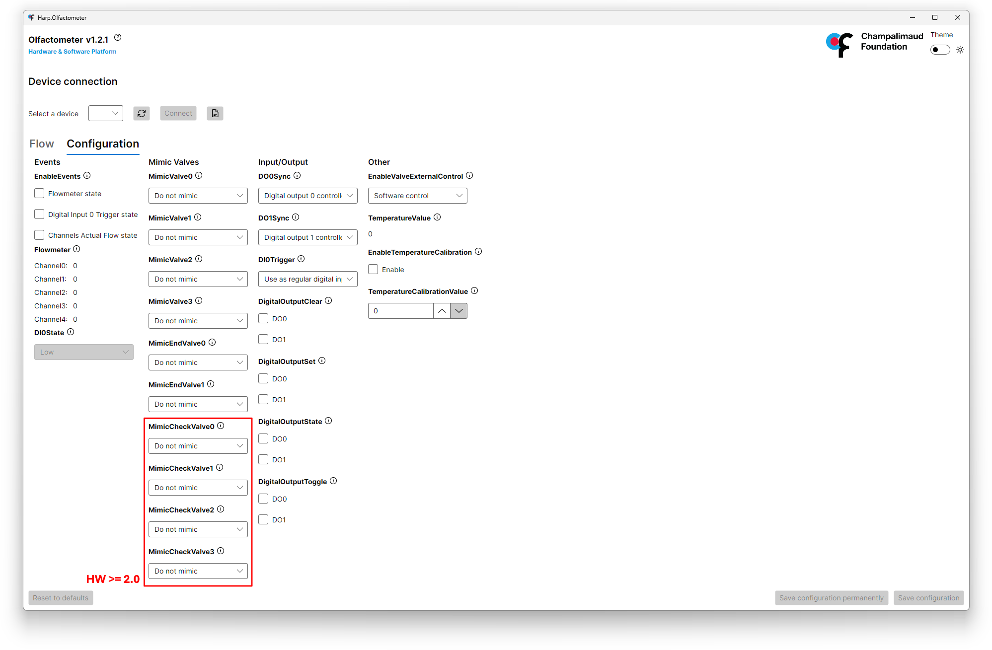 This section allows you to configure the input and output behavior of the olfactometer. You can set Digital Output 0 and Digital Output 1 to be either Controlled by software or to mimic Enable Flow register.